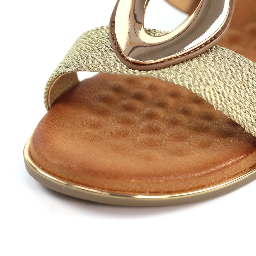 - Decoration: metallic strap, gold brooch on front strap and gold outer sole insert